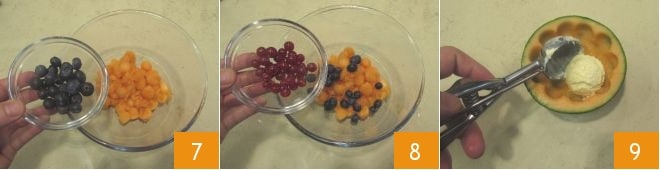 Fügen Sie die gewaschenen Blaubeeren 7 und die Johannisbeeren hinzu 8, wobei Sie 4 ganze Zweige zur Dekoration beiseitelegen. Nehmen Sie nun die ausgehöhlten Melonenschalen und füllen Sie sie mit Eiscreme 9, indem Sie 3 Kugeln in jede Schale legen.
