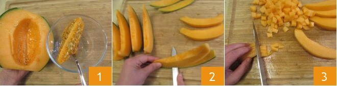 Um den Melonensalat zuzubereiten, beginnen Sie damit, die Melone zu reinigen. Entfernen Sie die beiden Enden, teilen Sie sie in zwei Hälften und entfernen Sie die Samen und Fäden mit einem Löffel 1. Dann schneiden Sie sie in Scheiben und entfernen die Schale 2, schließlich schneiden Sie sie in etwa 2 cm große Stücke 3.