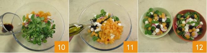 Fügen Sie auch die Melonenwürfel hinzu, würzen Sie dann mit Salz, Essig 10 und einem Spritzer Öl 11. Mischen Sie alles gut und servieren Sie Ihren Melonensalat, nach Belieben mit einem Zweig frischer Minze garniert 12.
