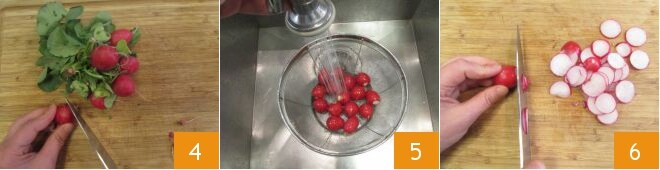 Stellen Sie sie beiseite und kümmern Sie sich um die Radieschen. Das Erste, was zu tun ist, ist die Blätter und den Teil mit dem Stiel zu entfernen 4. Waschen Sie sie gründlich 5 und schneiden Sie sie dann in dünne Scheiben 6.