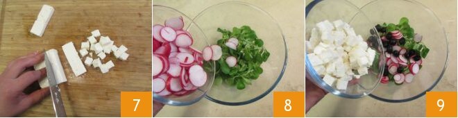 Schließlich schneiden Sie den griechischen Feta in kleine Stücke 7 und stellen Sie Ihren Salat zusammen. In eine Schüssel geben Sie den gewaschenen Feldsalat, die Radieschenscheiben 8, dann die entsteinten schwarzen Oliven und den Feta 9.