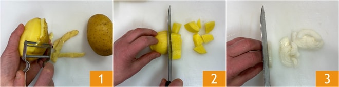 Um den Kabeljau im Eintopf zuzubereiten, schälen Sie zuerst die Kartoffeln 1 und schneiden Sie sie in Würfel von etwa 3 cm 2. Schälen und schneiden Sie die Zwiebel fein 3.