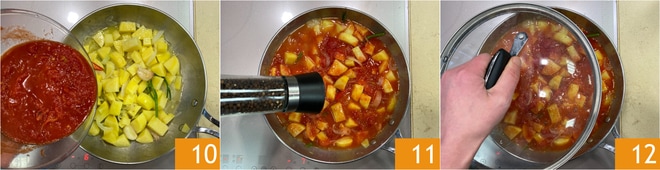 Fügen Sie nun die zerdrückten geschälten Tomaten hinzu 10, rühren Sie um und würzen Sie mit Salz und Pfeffer 11. Decken Sie die Pfanne mit einem Deckel ab 12 und lassen Sie es 30 Minuten bei mittlerer Hitze köcheln, gelegentlich umrühren, bis die Kartoffeln zart sind.
