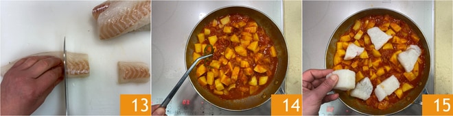 In der Zwischenzeit schneiden Sie die Kabeljaufilets in kleinere Stücke 13 und entfernen Sie eventuelle Gräten. Nach 30 Minuten entfernen Sie die Petersilienstängel und den Knoblauch aus der Pfanne 14 und legen Sie den Kabeljau hinein 15.