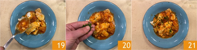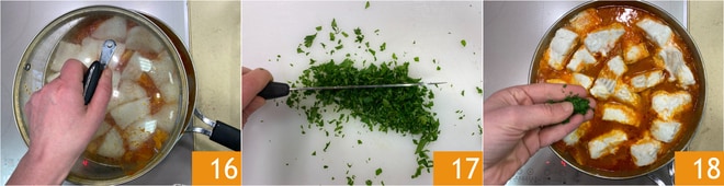 Decken Sie die Pfanne erneut mit einem Deckel ab 16 und kochen Sie für weitere 20 Minuten oder bis der Fisch gar ist. In der Zwischenzeit hacken Sie die Petersilienblätter fein 17 und streuen Sie sie am Ende des Kochvorgangs in die Pfanne 18.