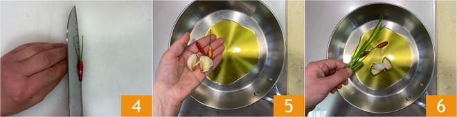 Teilen Sie die Chilischote in zwei Hälften 4. Erhitzen Sie in einer Pfanne das Öl zusammen mit der angedrückten Knoblauchzehe, der Chilischote 5 und den Petersilienstängeln 6.