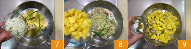 Fügen Sie die Zwiebeln in die Pfanne hinzu 7 und braten Sie sie für 7-8 Minuten an, bis die Zwiebeln durchsichtig werden. Geben Sie dann die Kartoffeln dazu 8 und braten Sie sie für 5 Minuten unter häufigem Rühren an. Löschen Sie mit Weißwein ab 9 und lassen Sie den gesamten Alkohol verdampfen, indem Sie gelegentlich umrühren.