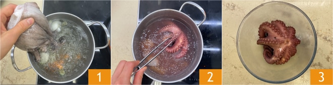 Um die mescafrancesca Kartoffeln und Fisch zuzubereiten, beginnen Sie mit dem Oktopus: Bringen Sie einen Topf mit Wasser zum Kochen, in den Sie grob geschnittene Karotten, Sellerie und Zwiebeln gegeben haben, tauchen Sie dann den Oktopus ein 1 und kochen Sie ihn 40 Minuten lang. Nach dieser Zeit den Oktopus abseihen 2 und in einer separaten Schüssel abkühlen lassen 3. Für weitere Details können Sie das Blatt "Wie man Oktopus reinigt und kocht" konsultieren.