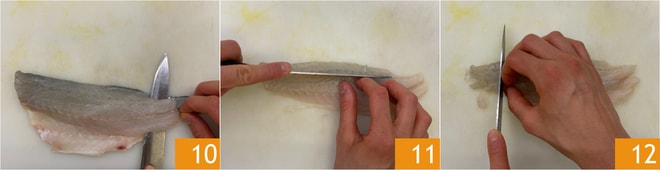 Machen Sie sich an die Reinigung der anderen Fische: Entfernen Sie die Haut vom Wolfsbarschfilet 10 und schneiden Sie es zunächst in Streifen 11 und dann in Würfel 12.