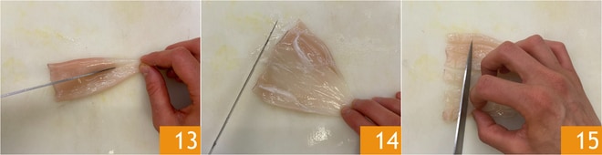 Reinigen Sie die Kalamare (für weitere Informationen können Sie das Blatt "Wie man Kalamare reinigt" konsultieren). Schneiden Sie den Mantel der Kalamare der Länge nach, um ihn zu öffnen 13, dann kratzen Sie die Innenseite mit dem Rücken eines Messers ab, um sie zu säubern und die Haut zu entfernen 14. Schneiden Sie die Kalamare ebenfalls in Streifen und dann in gleichmäßige Stücke 15.