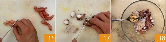 Reinigen Sie die Garnelen (für weitere Informationen können Sie das Blatt "Wie man Garnelen reinigt" konsultieren) und schneiden Sie das Fleisch in gleich große Stücke 16. Schließlich schneiden Sie auch 100 g gekochten Oktopus in Stücke 17. Übertragen Sie den Wolfsbarsch, die Kalamare, die Garnelen und den Oktopus in eine Schüssel, dann fügen Sie auch die geschälten Miesmuscheln und Venusmuscheln mit ihrem Flüssigkeit hinzu 18.