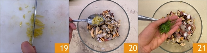 Hacken Sie die kandierte Zitrone fein 19 und geben Sie sie in die Schüssel mit den Fischen und Meeresfrüchten 20, dann würzen Sie auch mit dem Fenchel und dem in Julienne geschnittenen Basilikum 21. Schließlich mit Zitronensaft und einem Schuss Öl würzen, gut umrühren und beiseite stellen.