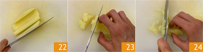 Kümmern Sie sich nun um die Kartoffeln: Schälen Sie sie und schneiden Sie sie zuerst in Scheiben und dann in Stäbchen 22. Schneiden Sie die mittleren Stäbchen, die gleichmäßiger sind, in Würfel 23, und zerkleinern Sie die seitlichen Teile 24.