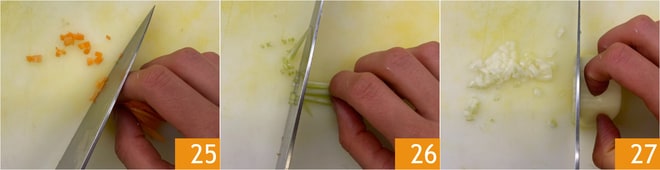 Schälen und schneiden Sie die Karotten 25, den Sellerie 26 und die Zwiebel 27 in feine Würfel.