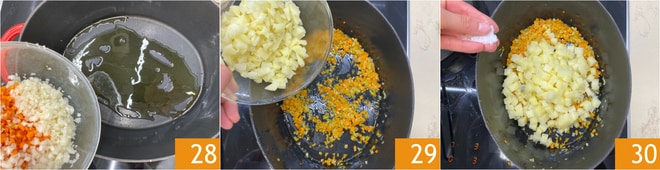 Sie können mit dem Kochen beginnen: Erhitzen Sie das Öl in einem großen Schmortopf, dann fügen Sie das Gemüse für das Sofrito hinzu 28 und braten Sie es bei schwacher Hitze etwa zehn Minuten lang an. Fügen Sie nun die Kartoffeln zum Sofrito hinzu 29 und salzen Sie 30.