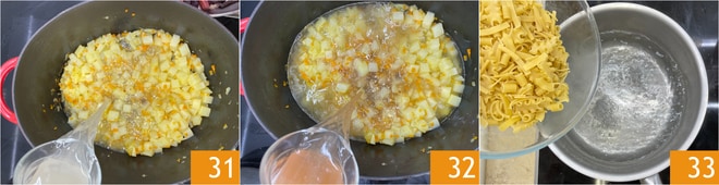 Gießen Sie den Fischfond 31 und den Krustentierfond 32 hinzu und kochen Sie bei mittlerer Hitze etwa 15-20 Minuten lang. In der Zwischenzeit bringen Sie einen Topf mit gesalzenem Wasser zum Kochen und kochen Sie die gemischte Pasta etwa 4 Minuten lang 33.