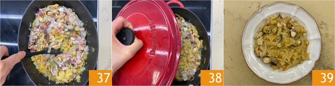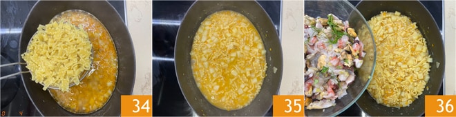 Sieben Sie die Pasta ab, übertragen Sie sie in den Schmortopf 34 und kochen Sie sie etwa weitere 5 Minuten lang 35. Wenn die Pasta al dente ist und die Kartoffeln weich und cremig sind, schalten Sie die Hitze aus und warten, bis das Kochen vorbei ist, dann fügen Sie alle Fische hinzu 36.