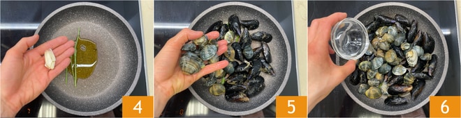 In der Zwischenzeit kümmern Sie sich um die Meeresfrüchte: Reinigen Sie die Miesmuscheln und Venusmuscheln (für weitere Informationen können Sie unsere Blätter "Wie man Miesmuscheln reinigt und öffnet" und "Wie man Venusmuscheln reinigt" konsultieren). In einer großen Pfanne das Öl mit den Stängeln von Petersilie und einer Knoblauchzehe anbraten 4, dann die Miesmuscheln und Venusmuscheln hinzufügen 5. Etwas Wasser hinzufügen 6 und bei starker Hitze unter häufigem Schwenken der Pfanne kochen.