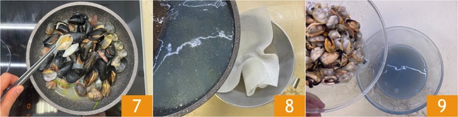 Sobald sich die Schalen öffnen, entfernen Sie die Meeresfrüchte mit einer Zange 7 und legen Sie sie beiseite. Wenn sich alle geöffnet haben, seihen Sie den Kochsud durch eine Chinoise 8. Jetzt schälen Sie die Miesmuscheln und Venusmuscheln und bewahren die Schalentiere im gefilterten Kochsud auf 9.