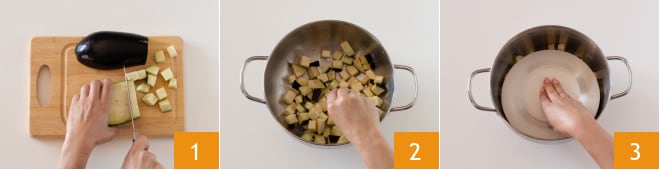 Um die Mezze Maniche mit Auberginen und geräuchertem Scamorza zuzubereiten, beginnen Sie mit den Auberginen: putzen Sie sie, schneiden Sie sie in Würfel von 1,5 - 2 cm 1 und geben Sie sie in ein Sieb mit einer Prise Salz 2, dann legen Sie ein Gewicht darauf für mindestens eine halbe Stunde. So verlieren sie das bittere Wasser 3