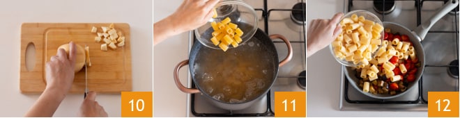 Schneiden Sie den geräucherten Scamorza in Würfel 10 und kochen Sie die Pasta in kochendem Salzwasser 11. Wenn sie al dente ist, geben Sie sie in die Sauce 12.