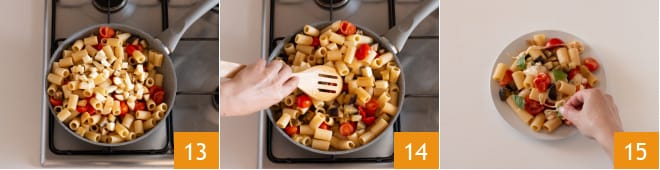 Fügen Sie auch die Scamorza-Würfel hinzu 13, geben Sie einen kurzen Hitzestoß, bis der Käse leicht schmilzt 14, und servieren Sie. Ihre Mezze Maniche mit Auberginen und geräuchertem Scamorza sind bereit, mit etwas zerhacktem Basilikum auf jedem Teller genossen zu werden 15.