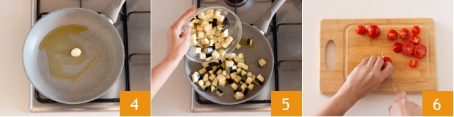Nach dieser Zeit erhitzen Sie einen Schuss Öl in einer Pfanne mit einer geschälten Knoblauchzehe 4, geben Sie die Auberginen hinzu und lassen Sie sie bei mittlerer Hitze 6-7 Minuten kochen 5. In der Zwischenzeit vierteln Sie die Kirschtomaten 6.
