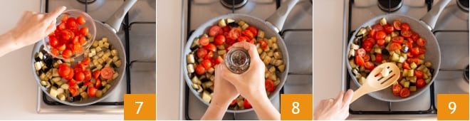 Fügen Sie sie den Auberginen hinzu 7, mischen Sie alles, würzen Sie mit Salz und Pfeffer 8 und kochen Sie es 5 Minuten unter gelegentlichem Rühren weiter 9
