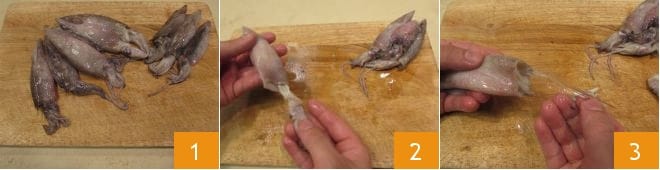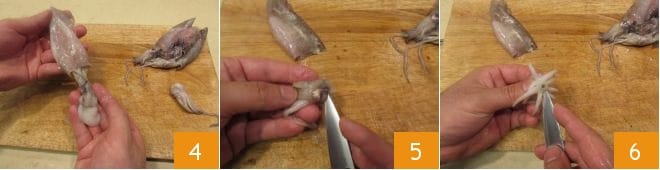 Entfernen Sie dann die Innereien 4 und spülen Sie den Mantel gründlich von innen aus. Entfernen Sie anschließend die Augen vom Kopf mit Hilfe eines Messers 5 und führen Sie dieselbe Operation auch für den Schnabel 6 durch, der sich in der Mitte der Tentakel befindet,