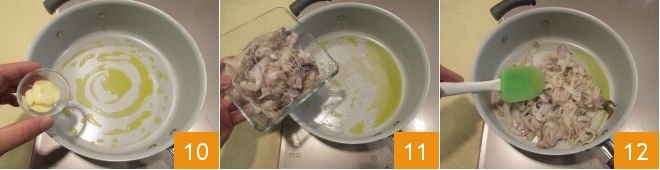 und erhitzen Sie in der Zwischenzeit den Knoblauch in einer Pfanne mit etwas Olivenöl extra vergine 10. Sobald er gut gebräunt ist, entfernen Sie ihn und braten die Tintenfische in der Pfanne an 11, für zwei Minuten, gelegentlich umrührend 12, um sie gleichmäßig zu bräunen.