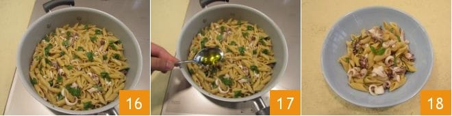 fügen Sie es in die Pfanne hinzu 15 und würzen Sie das Ganze schließlich mit einem Esslöffel Olivenöl extra vergine 16. Ihre Vollkorn-Penne mit Tintenfischen in Weißwein sind bereit zum Servieren!