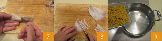ziehen Sie die Haut von den Tentakeln und dem Mantel ab 7. Spülen Sie alle Teile des Tintenfisches gründlich unter fließendem Wasser ab; dann schneiden Sie den Mantel 8 und die Tentakel in Streifen; legen Sie sie beiseite. In einem großen Topf bringen Sie gesalzenes Wasser zum Kochen und kochen die Pasta 9,