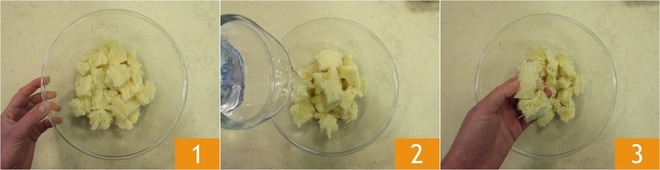 Um die Mikrowellen-Frikadellen zuzubereiten, geben Sie zuerst die Brotkrume von altem Brot in eine Schüssel 1. Fügen Sie Wasser hinzu, bis es bedeckt ist, und lassen Sie es einweichen 2 für ein paar Minuten 3. In der Zwischenzeit hacken Sie den Knoblauch und die Petersilie fein mit dem Messer.