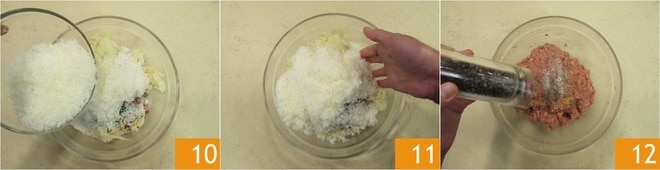 Fügen Sie den geriebenen Grana und Pecorino hinzu 10. Kneten Sie alles gut mit den Händen durch 11, würzen Sie mit Salz und Pfeffer 12.