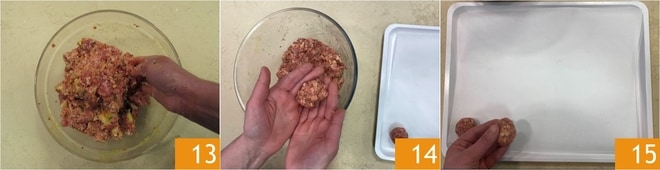 Kneten Sie ein letztes Mal, bis Sie eine homogene Masse erhalten 13. Decken Sie die Schüssel mit einem Teller ab und lassen Sie sie 15 Minuten im Kühlschrank ruhen. Nach der Ruhezeit können Sie die Frikadellen formen. Für jede benötigen Sie etwa 30 g Masse und sollten eine kugelförmige Form geben, indem Sie die Masse zwischen den Händen rollen 14. Legen Sie sie nach und nach auf ein Tablett 15.