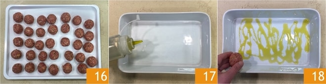 Am Ende sollten Sie etwa 16 Stück erhalten 16. Fetten Sie eine Auflaufform ein 17 und legen Sie die Frikadellen hinein 18.