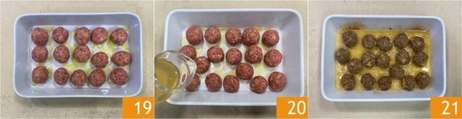 Wenn die Frikadellen ordentlich in der Auflaufform verteilt sind 19, gießen Sie die lauwarme Brühe darüber 20. Stellen Sie sie in die Mikrowelle bei 650 W für 10 Minuten. Nach den 10 Minuten stellen Sie die Grillfunktion ein und backen weitere 7 Minuten. Die Mikrowellen-Frikadellen sind bereit zum Servieren 21.