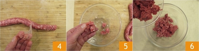 Nehmen Sie die Wurst, schneiden Sie die Pelle ein und entfernen Sie sie 4. Zerkleinern Sie sie mit den Händen in einer Schüssel 5. Fügen Sie dann das Hackfleisch hinzu.