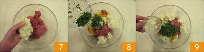 Geben Sie die gut ausgedrückte Brotkrume hinzu 7, das Ei, die gehackte Petersilie 8 und den gehackten Knoblauch 9.