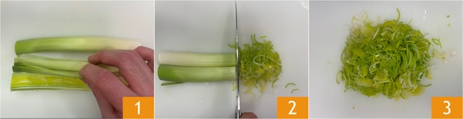 Um die Kichererbsensuppe in der Mikrowelle zuzubereiten, weichen Sie zunächst die Kichererbsen 12 Stunden lang mit einer Prise Natron ein. Entfernen Sie die äußeren Blätter des Lauchs 1 und schneiden Sie ihn fein in Ringe 2 3.