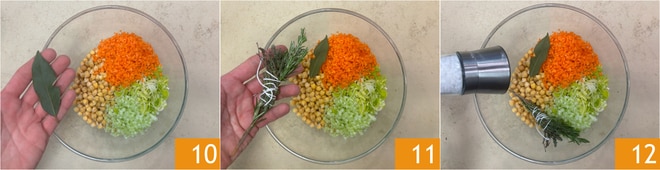 Fügen Sie die Lauchringe, die Karotte, den Sellerie, das Lorbeerblatt 10 und ein Kräutersträußchen 11 hinzu, bestehend aus einem Zweig Rosmarin und Thymian, die mit Küchengarn zusammengebunden sind. Würzen Sie mit Salz 12.