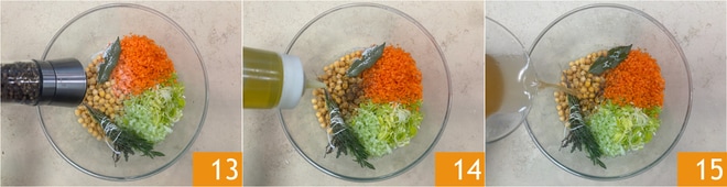 Fügen Sie den Pfeffer 13, das Öl 14 und die Gemüsebrühe 15 hinzu.