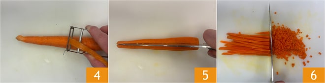 Schälen Sie eine Karotte 4 und schneiden Sie sie zunächst in Stifte 5 und dann in Würfel 6.