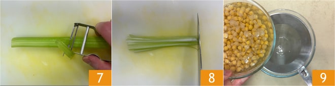 Schälen Sie den Sellerie, um die Fäden zu entfernen 7, und schneiden Sie ihn ebenfalls in Würfel 8. Lassen Sie die Kichererbsen abtropfen 9 und geben Sie sie in eine große mikrowellengeeignete Schüssel.