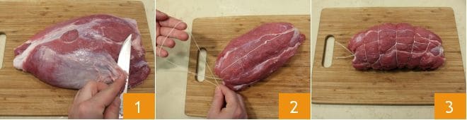 Um den Milchbraten zuzubereiten, beginnen Sie damit, das Fleisch zu binden, indem Sie den Anweisungen auf der Seite der Kochschule Wie man den Braten bindet folgen. Legen Sie das Fleisch auf ein Schneidebrett, in unserem Fall die Kalbshüfte, und entfernen Sie den Knorpel und das überschüssige Fett, das sonst während des Garens hart werden könnte 1. Dann formen Sie mit Küchengarn das Netz (2-3).