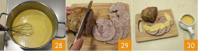 mischen Sie mit einem Schneebesen 28 und kochen Sie bei niedriger Hitze, um die Sauce zu verdicken. Wenn die Sauce cremig ist, schalten Sie das Feuer aus und gießen Sie sie in eine Sauciere. Nehmen Sie den Milchbraten, schneiden Sie ihn in Scheiben 29 und servieren Sie ihn mit der heißen Sauce 30.