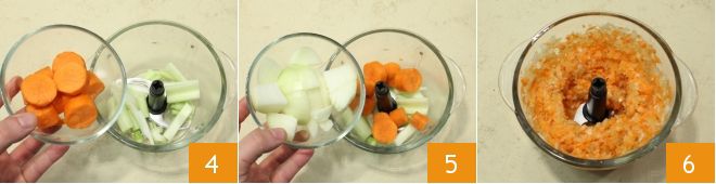 Hackfleisch das Gemüse für das Soffritto: Geben Sie Sellerie, Karotte 4 und Zwiebel 5 in den Mixer, zerkleinern Sie sie fein 6 und stellen Sie die Gemüse-Mischung für das Soffritto beiseite.