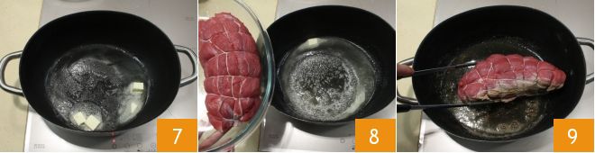 Nun stellen Sie einen großen Topf auf die Herdplatte, schmelzen 30 g Butter 7, geben Sie den Braten hinein 8 und braten Sie das Fleisch von allen Seiten an 9.