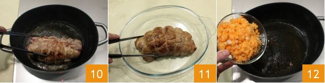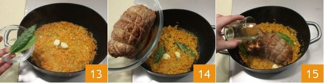 fügen Sie dann 2 Knoblauchzehen und die Lorbeerblätter hinzu 13. Wenn das Soffritto gut eingekocht ist, geben Sie den Kalbsbraten hinzu 14, löschen Sie dann mit dem halben Glas Wein ab 15, lassen Sie den Alkohol verdampfen und salzen und pfeffern Sie.