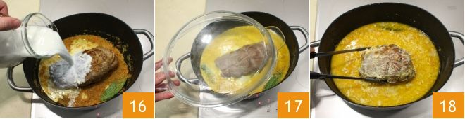 Nun fügen Sie die bereits erwärmte Milch hinzu 16, decken Sie den Topf ab 17 und kochen weiter, bis das Fleisch im Inneren gut gegart ist, etwa 50 Minuten lang. Nach dem Garen nehmen Sie das Fleisch heraus 18.